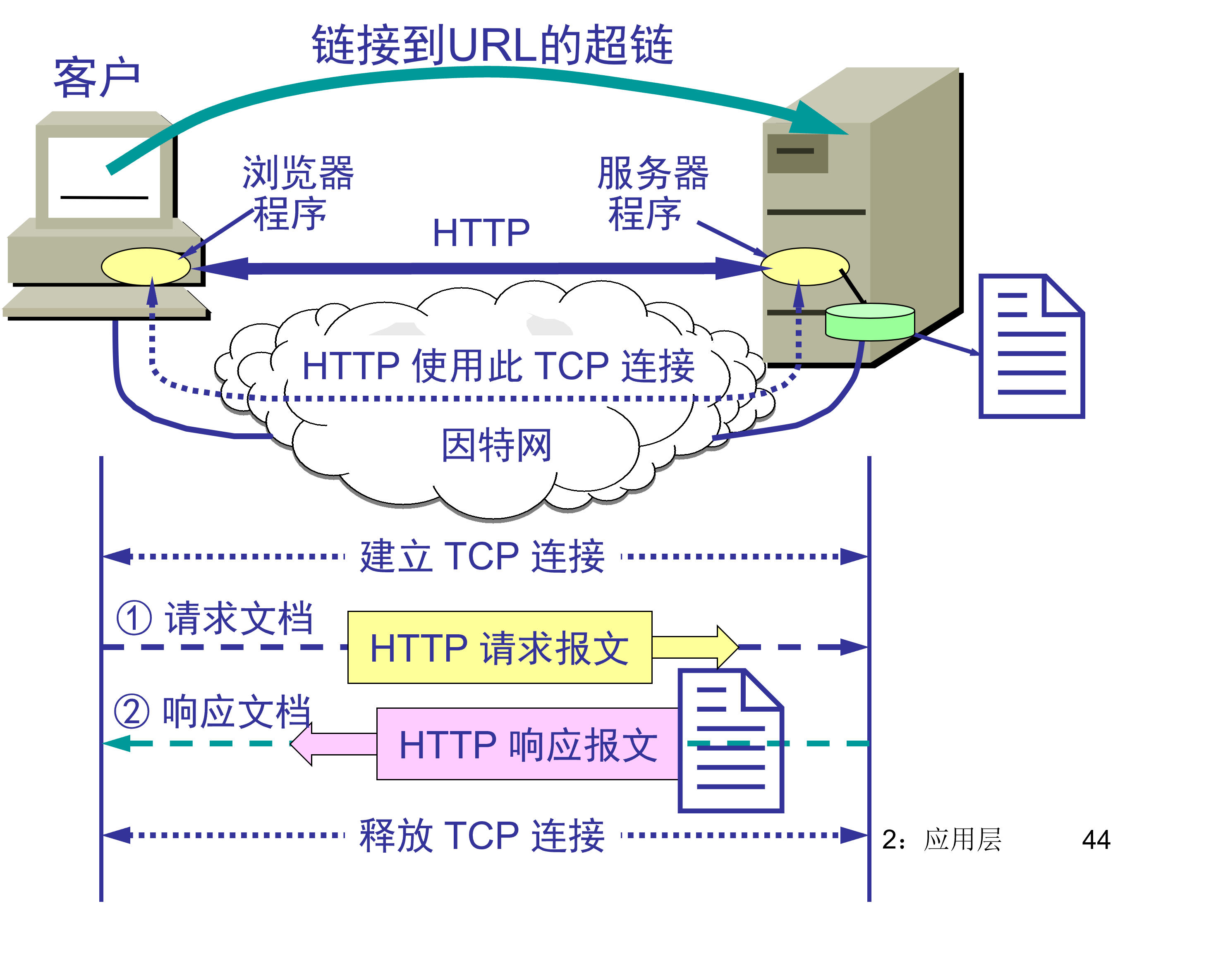 Web层应用层协议为超文本传输协议(hypertext transfer protocol, HTTP),是Web应用的核心;遵循C/S架构,浏览器browser请求, 接收, 解释显示 Web对象,Web服务器响应请求,发送 Web对象;