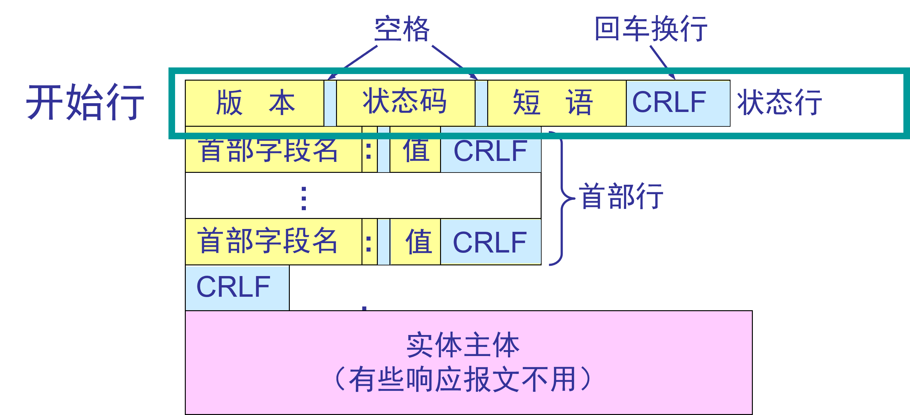 - **起始行 **(start line):一行文本,包含报文类型的基本信息,分为请求行和响应行;