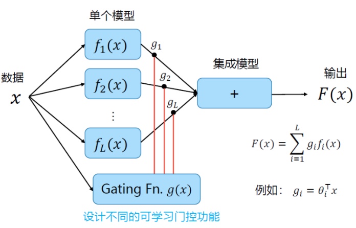 门控:训练集成模型时更新所有模型,比如自动驾驶中面对复杂的不同场景,切换不同的模型