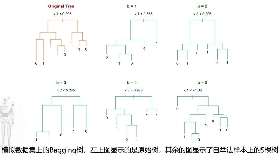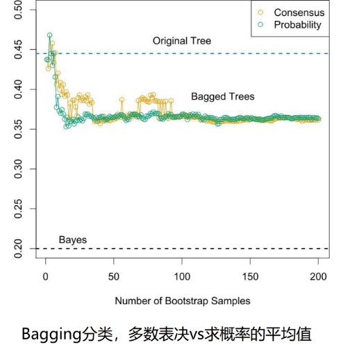 Bagging后的集成模型偏差和原始模型相同,但是降低了反差,对低偏差高反差的预测模型的提升效果显著;