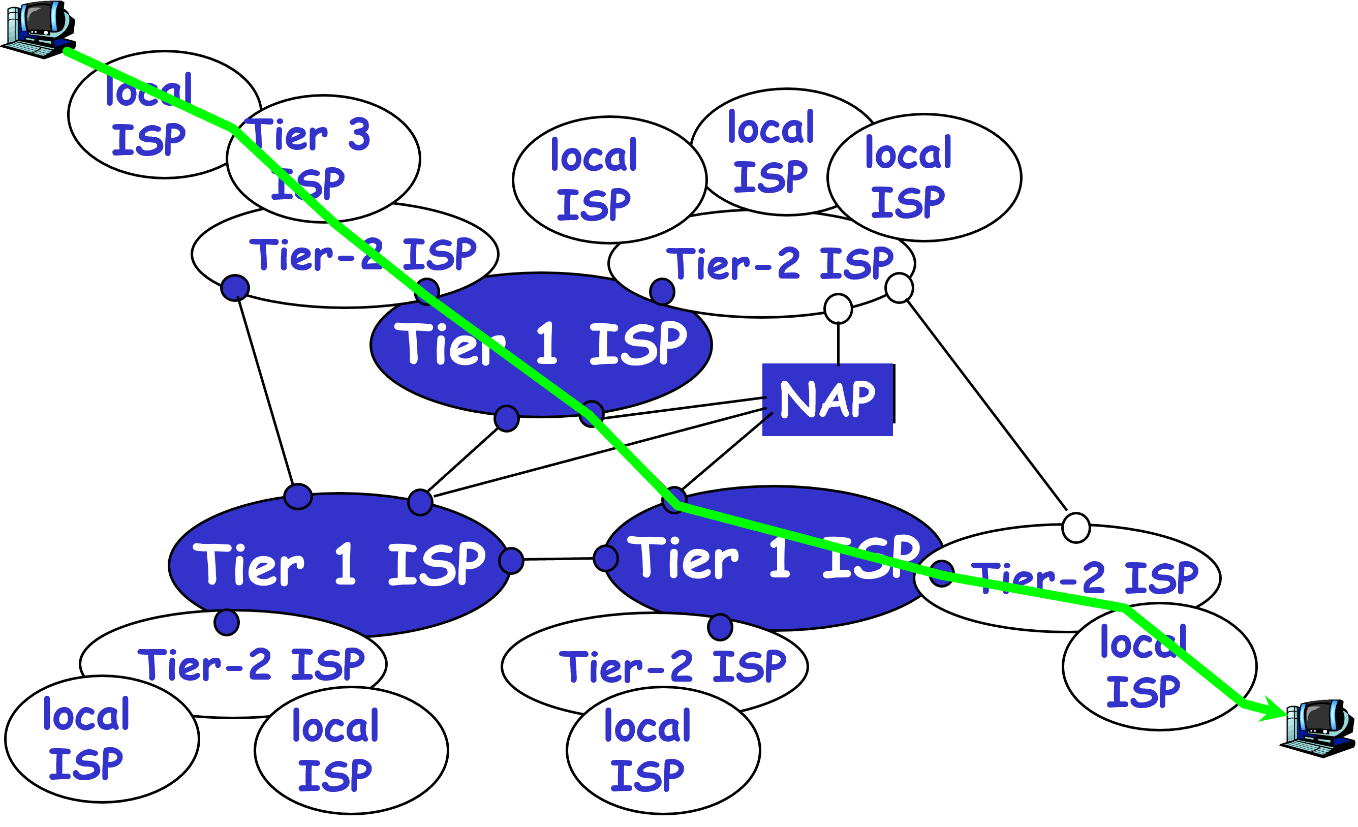 - 第一层ISP (Tier 1 ISP):这些是全球性的ISP,它们互相连接形成Internet的核心骨干网。它们通常不向最终用户提供接入服务,而是通过**对等(peering)**协议与其他第一层ISP直接连接,并且通过IXP与其他ISP(如区域ISP)连接。