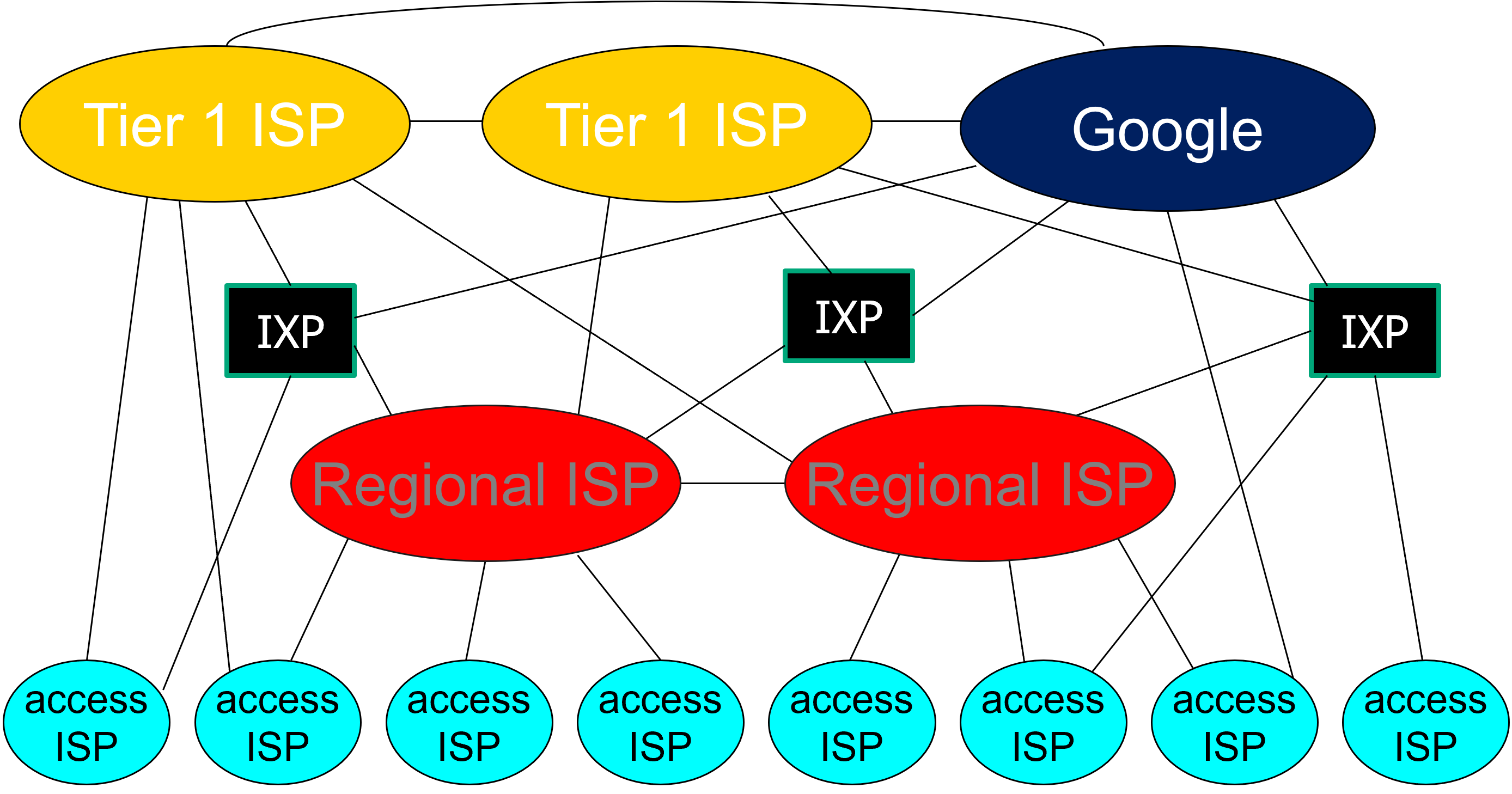 此外,大型内容提供商(如Google)也拥有自己的私有网络,并通过IXP或直接连接到第一层ISP和区域ISP,以便高效地向最终用户交付内容。