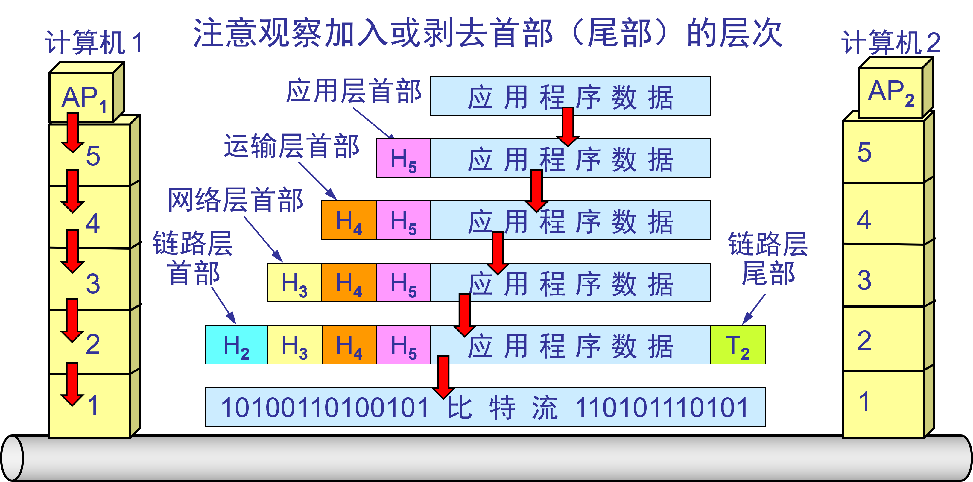 数据封装 (Encapsulation):当应用层的报文通过协议栈向下传递时,每一层都会给报文添加首部信息(有时还有尾部信息),这个过程称为封装。每一层的数据单元都包含上一层的数据单元作为其载荷。