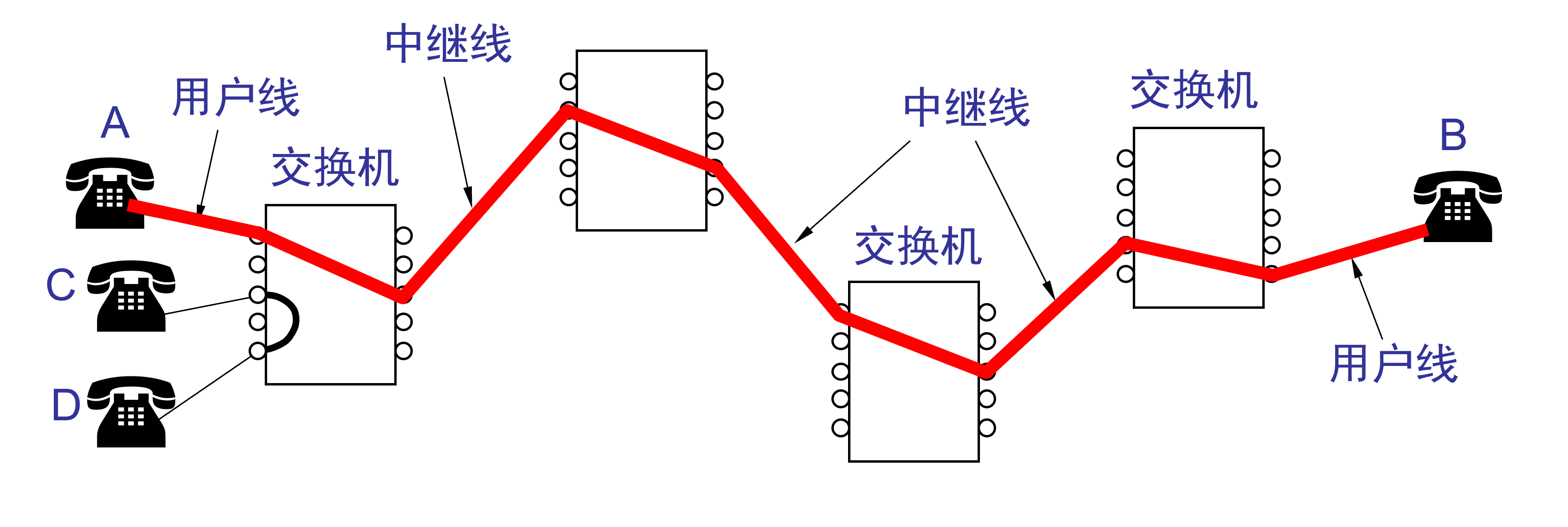 电路交换(circuit switching)发生在电话网中,每次会话预留沿其路由所需的独占资源,包括缓存和链路传输速率等;
