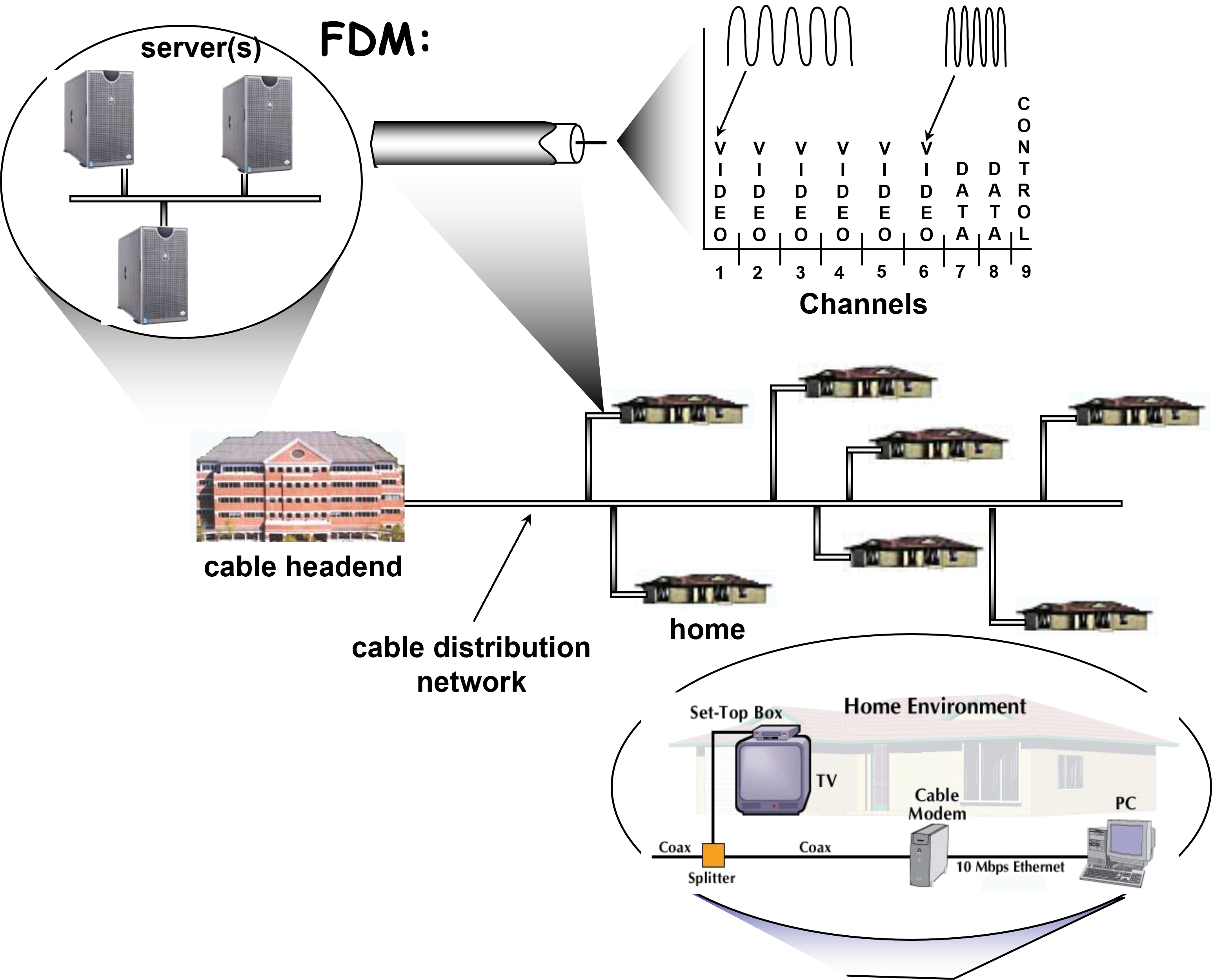 - 广播式下行链路:头端(服务提供商)到所有家庭的下行链路是单条共享的物理线路(如同轴电缆)。头端发送的每个分组数据会广播到该链路连接的所有家庭,而非独立传输给单个用户。
